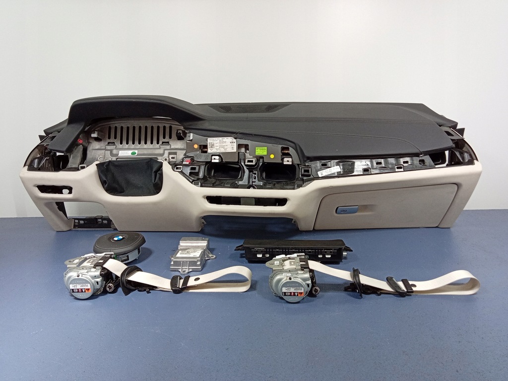 Omschrijving: set, Europees dashboard 9471886, leer, met ruimte voor HUD-display, zwart lederen bovenkant met bruine stiksels, onderkant ivoorwit, bestuurdersairbag sport 8094575, passagiersairbag 9382489, knie-airbag 9363845, veiligheidsgordels voorin 7497877, 7497878, sensor airbag controller 9890599, board niet geregenereerd, -kwaliteit A && BMW X5 G05 BOARD CONSOLE KUSSENS HUD RIEMEN EU