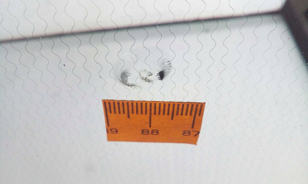 RAAM IN GOEDE STAAT MET GEREPAREERDE EN VEILIGE GROTE PUNT AAN DE PASSAGIERSZIJDE EN EEN PUNT OP DE BLAUWE BAND AAN DE PASSAGIERSZIJDE OP DE GEMARKEERDE PLAATS